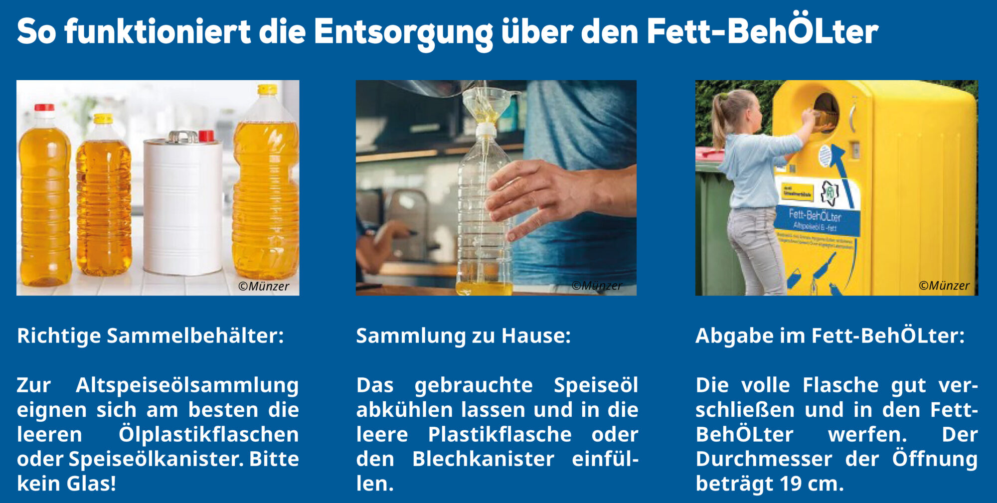 Das gesammelte Altspeiseöl und -fett wird von der Firma Münzer zu hochwertigem Bio-Diesel verarbeitet. Mit der richtigen Entsorgung von Altspeiseöl und -fett trägt man aber nicht nur aktiv zum Umweltschutz bei, sondern man vermeidet auch kostspielige Reparaturen von Verstopfungen im häuslichen Abwassersystem und schont das eigene Haushaltsbudget.